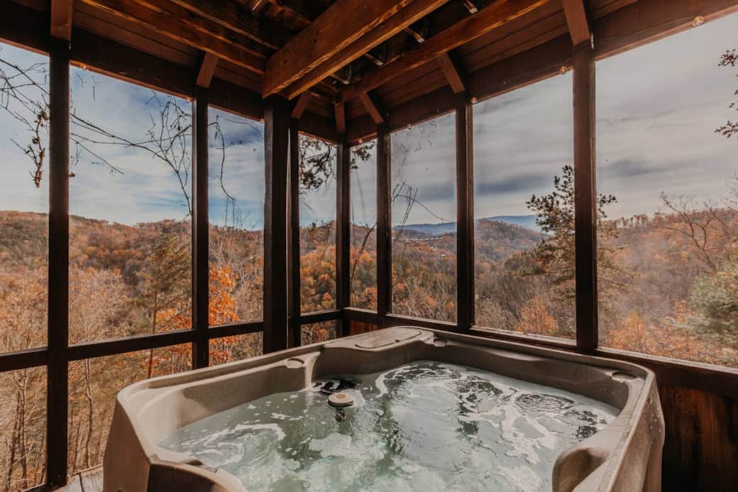 Escape to this 2-bedroom cabin in Wears Valley with 280° Smoky Mountain views, a hot tub, fire pit, and plenty of space for family or friends.
